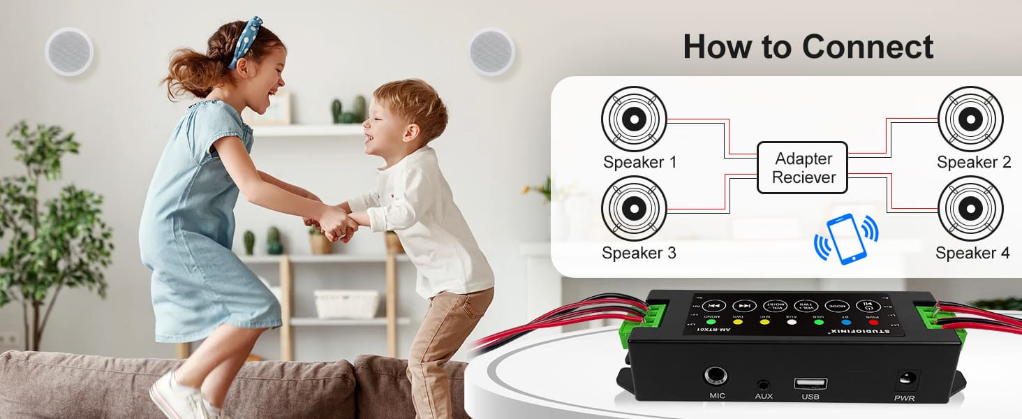 Upgrade your home, marine, or commercial speaker setup with the STUODIOFINIX 4-Channel Mini Bluetooth Amplifier. Designed for passive wall-mounted, ceiling, marine, and bookshelf speakers, this powerful unit delivers up to 120W of clear and stable sound output.
